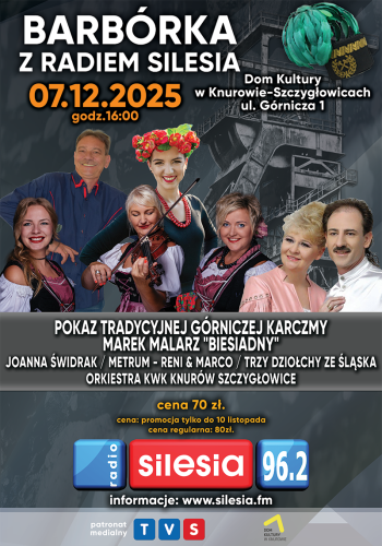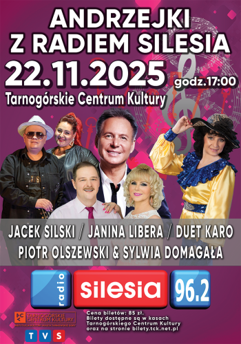 Kochani Państwo 22.listopada – w sobotę – o 17:00 zapraszamy do TARNOWSKICH GÓR do Tarnogórskiego Centrum Kultury (ul. Jana III Sobieskiego 7) na ANDRZEJKI Z RADIEM SILESIA.
